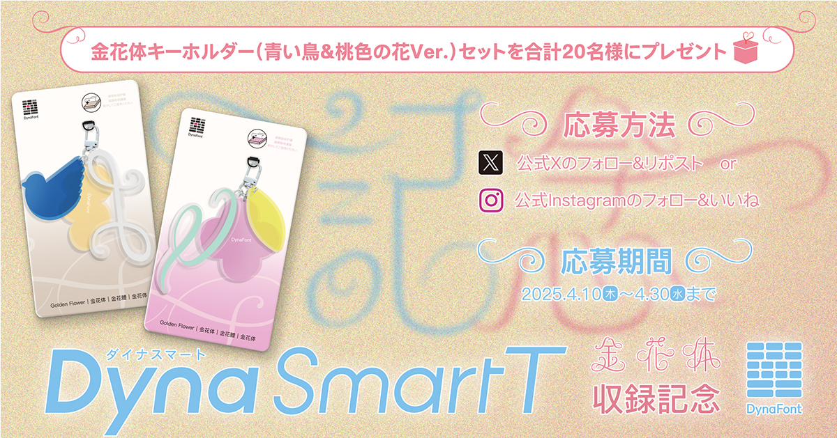 「ダイナフォント金花体キーホルダーセット」が、DynaSmart Tへの金花体収録を祝い、抽選で20名様にプレゼントされるキャンペーンが行われます。 概要 キャンペーン名:金花体のDynaSmart T収録記念「ダイナフ… 続きを読む